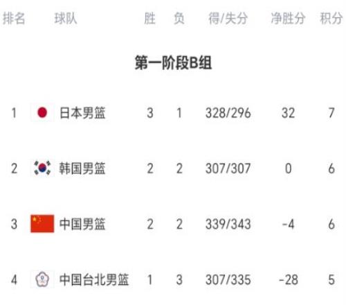 B組四輪過后,日本隊3勝1負穩(wěn)居第一,韓國隊、中國隊都是2勝2負,中國隊凈勝分落后4分,仍然排名第三,中國臺北隊1勝3負穩(wěn)居墊底。盡管排名沒有變化,但晉級形勢再度有變,中國隊形勢柳暗花明。 |