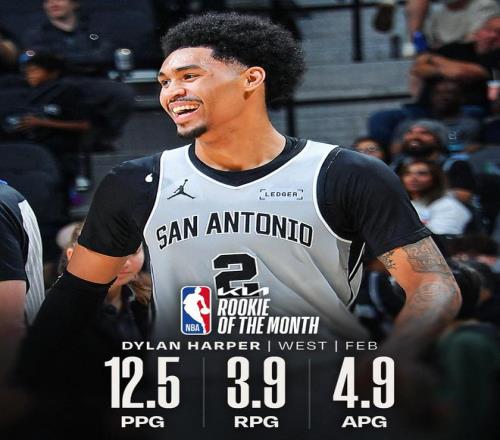 馬刺在2月則取得了11戰(zhàn)全勝的完美戰(zhàn)績,其中迪倫-哈珀場均貢獻12.5分3.9籃板4.9助攻,最終他也被評為了NBA2月西部最佳新秀。 |