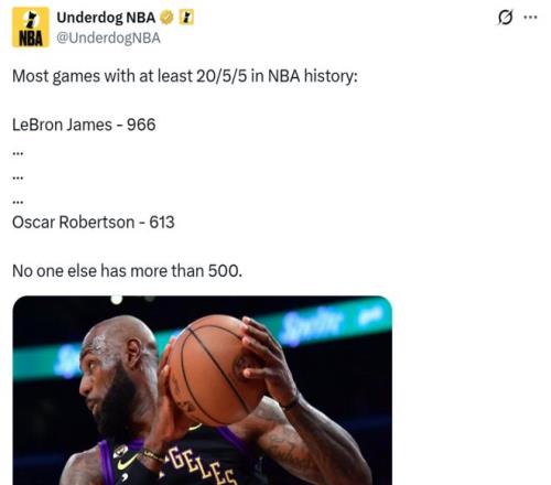憑借這樣的表現(xiàn),41歲的詹姆斯成為26年至今聯(lián)盟唯二拿到至少600分200助的球員,另外一人是他的隊友東契奇。 同時這是詹姆斯生涯第966場至少拿到20分5板5助,NBA歷史斷檔第一,大O以613場排在第二,兩人也是NBA歷史上唯二至少500場拿下20+5+5的球員。 并且詹姆斯的傳奇生涯還在繼續(xù),已經(jīng)預(yù)定了又一項NBA歷史第一紀錄,本場結(jié)束后詹姆斯生涯總命中數(shù)來到15835記,距離賈巴爾歷史第一的15837記僅差2記,不出意外,下一場將實現(xiàn)反超。