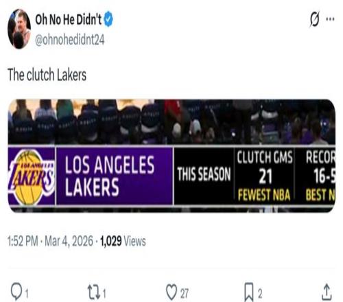 即便如此,東契奇在關(guān)鍵時刻的能力毋庸置疑,攜手詹姆斯與里夫斯在關(guān)鍵時刻打出一波流表現(xiàn)逆轉(zhuǎn)反超比分。 三人關(guān)鍵時刻夸張的能力也直觀展現(xiàn)在湖人隊戰(zhàn)績方面,本場比賽拿下勝利后,湖人隊本賽季關(guān)鍵時刻(最后5分鐘分差5分以內(nèi))拿下17勝5負聯(lián)盟第一戰(zhàn)績。 只不過,湖人隊本賽季僅22次進入關(guān)鍵時刻聯(lián)盟最少,也是這支湖人隊特點的縮影,要么直接打花比賽,要么直接被對手打花,很少進入艱難的拉鋸階段。