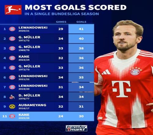 1. 萊萬多夫斯基(拜仁慕尼黑) 29場41球(2020-21賽季) 2. 蓋德-穆勒(拜仁慕尼黑) 34場40球(1971-72賽季) 3. 蓋德-穆勒(拜仁慕尼黑) 33場38球(1969-70賽季) 4. 哈里-凱恩(拜仁慕尼黑) 32場36球(2023-24賽季) 5. 蓋德-穆勒(拜仁慕尼黑) 33場36球(1972-73賽季) 6. 萊萬多夫斯基(拜仁慕尼黑) 34場35球(2021-22賽季) 7. 萊萬多夫斯基(拜仁慕尼黑) 31場34球(2019-20賽季) 8. 迪特-穆勒(科隆) 34場34球(1976-77賽季) 9. 奧巴梅揚(多特蒙德) 32場31球(2016-17賽季) 11. 哈里-凱恩(拜仁慕尼黑) 24場30球(2025-26賽季) |