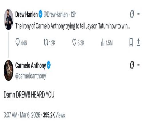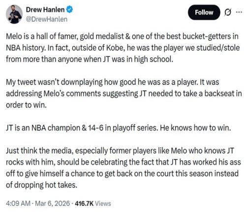 但塔圖姆的訓(xùn)練師Drew Hanlen不干了。 他直接發(fā)推嘲諷:“安東尼教塔圖姆去如何爭冠……真諷刺?!?/p> 這一下捅了馬蜂窩。安東尼空降評論區(qū):“你為什么不問問你的客戶,誰最支持他呢。不過還是要尊重這位冠軍?。∥衣牭搅?!” Hanlen隨即正面回應(yīng),先是夸了一通安東尼的名人堂身份,然后話鋒一轉(zhuǎn):“我的推文并不是貶低他,而是回應(yīng)他關(guān)于塔圖姆需要退居二線才能贏球的言論。塔圖姆是NBA總冠軍,季后賽系列賽戰(zhàn)績14勝6負(fù),他知道如何贏球?!?/p>