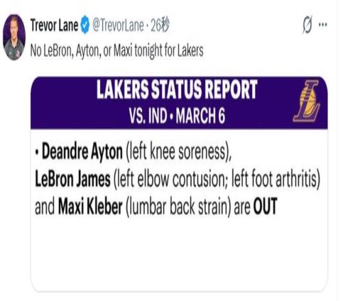 左肘挫傷+左腳關(guān)節(jié)炎!老詹今日缺戰(zhàn)步行者湖人共計(jì)三人無法出場