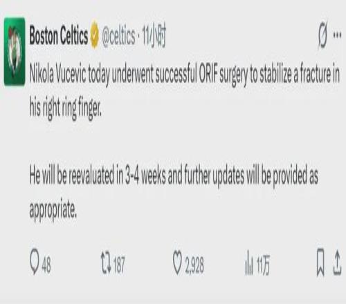 北京時間3月8日,凱爾特人官方宣布:球隊中鋒武切維奇今日成功接受右手無名指骨折的切開復(fù)位內(nèi)固定術(shù)(ORIF),將在3-4周后進(jìn)行復(fù)查。常規(guī)賽將在4月中旬結(jié)束,還有5周的時間,凱爾特人希望武切維奇能在收官階段復(fù)出。
