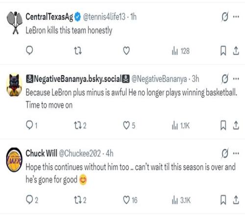 1.把詹姆斯趕出我的隊(duì)伍?。?! 2.你可以看出東契奇、里夫斯、艾頓…以及整個(gè)球隊(duì)…都已經(jīng)無(wú)法忍受勒布朗; 3.勒布朗需要去一個(gè)可以讓布朗尼登場(chǎng)打球的地方; 4.勒布朗真誠(chéng)的殺死了這支球隊(duì); 5.因?yàn)槔詹祭实男Ч秦?fù)面的,他根本不是為了勝利而打球; 6.希望他就這樣離開(kāi)了,這個(gè)賽季結(jié)束他就離開(kāi)LAL了吧; |