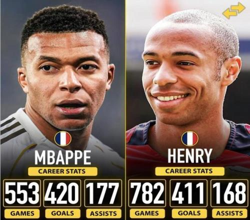 姆巴佩亨利對比:出場少200多場數(shù)據(jù)已超亨利!歷史地位會改寫嗎