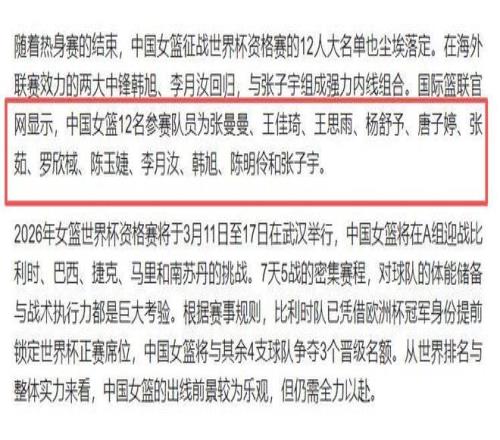 女籃新扛旗人 3月11號(hào),備受矚目的女籃世預(yù)賽資格賽馬上就要開打了。 就在2026年3月10日,國(guó)家隊(duì)終于把這12人的出征大名單給亮出來了。 這名單一出來,不僅在籃球論壇里刷了屏,就連很多平時(shí)偶爾看球的球迷都懵了。 為什么,因?yàn)檫@次新老交替的速度和力度,完全超出了大家的預(yù)料。