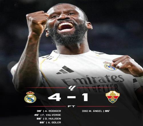 第90分鐘,剛剛替補登場的居萊爾在本方半場得球,看到門將站位靠前,他毫不猶豫直接起腳吊射。皮球從半場飛越門將頭頂直入球網(wǎng),皇馬4-1,伯納烏瞬間陷入瘋狂,這粒進(jìn)球甚至讓人想起當(dāng)年貝克漢姆的經(jīng)典遠(yuǎn)距離吊射。 最終皇馬4-1大勝埃爾切,各項賽事迎來3連勝。盡管多賽一場,但他們依然只落后榜首的巴薩1分,西甲爭冠懸念相當(dāng)?shù)拇碳?!接下來皇馬還將迎來真正的考驗,下周中,他們將做客阿提哈德球場,再次挑戰(zhàn)曼城。由于首回合在伯納烏3-0完勝對手,為晉級搶占了先機。如果能夠延續(xù)近期的狀態(tài),這只傷兵滿營卻斗志十足的銀河戰(zhàn)艦,晉級問題不大。
