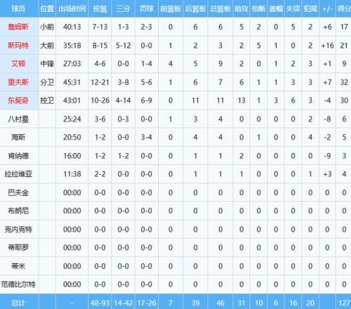 湖人四人得分上雙,東契奇30分11板13助3帽,里夫斯32分7板6助,詹姆斯17分6板5助2斷,斯瑪特扔進(jìn)5記三分球轟下21分3板2助5斷。
