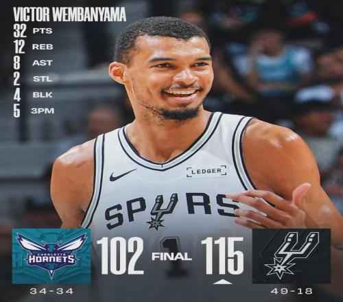 北京時間3月15日,今早結(jié)束的一場NBA常規(guī)賽:馬刺115-102力克黃蜂。文班亞馬本場復(fù)出:出戰(zhàn)31分鐘,投籃24中13,三分10中5,罰球2中1,砍下32分12籃板8助攻2搶斷4蓋帽。最新一期MVP排行榜,文班已經(jīng)升至第二。