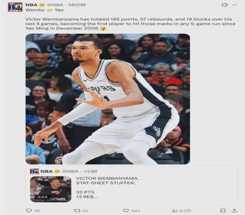NBA官方寫道:“文班亞馬在過去的5場比賽一共得到165分、57個籃板和19次蓋帽,成為自2006年12月姚明以來,首位在連續(xù)5場比賽達成這些數(shù)據(jù)的NBA球員?!碑?dāng)時火箭隊的賽季場均得分只有90多分,大家可以想象姚明有多強。